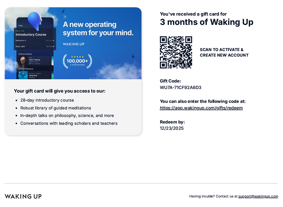 PS. I purchased a lifetime membership to the Waking Up app a few years ago. This year they sent me a code to share that grants three months of free access to the app. This code can only be used 50 times, so once it is claimed, it is gone (PS. I don’t get anything from this promotion, since I’m a lifetime member, I’m sharing because I really like Sam’s app as a meditation resource).